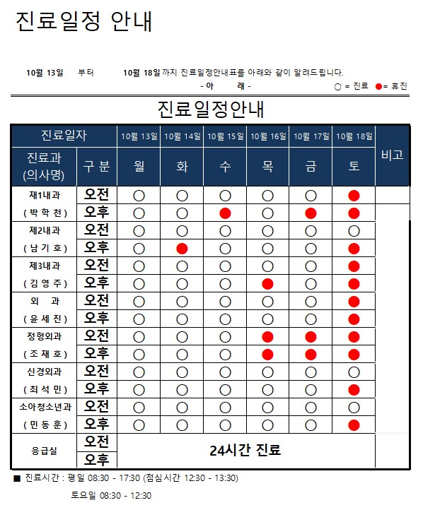 진료일정표 안내(10월 13일 ~ 10월 18일)