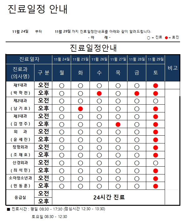 진료일정표 안내(11월 24일 ~ 11월 29일)