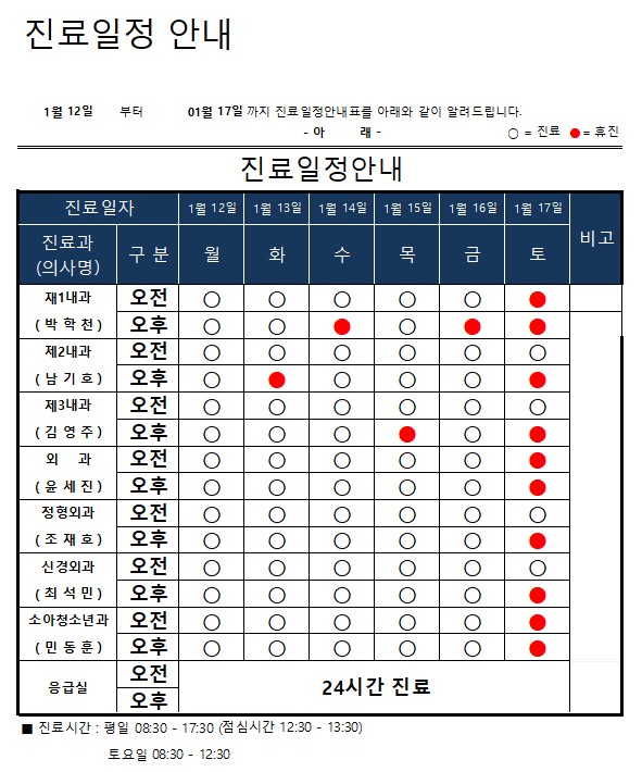 진료일정표 안내(01월 12일 ~ 01월 17일)