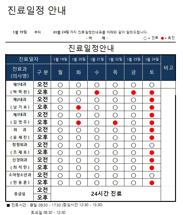제목 : 진료일정표 안내(01월 19일 ~ 01월 24일)