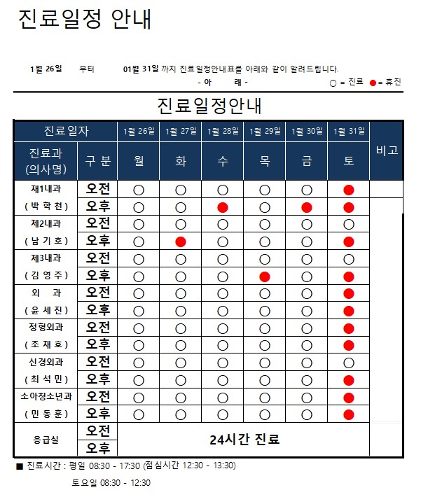 진료일정표 안내(01월 26일 ~ 01월 31일)