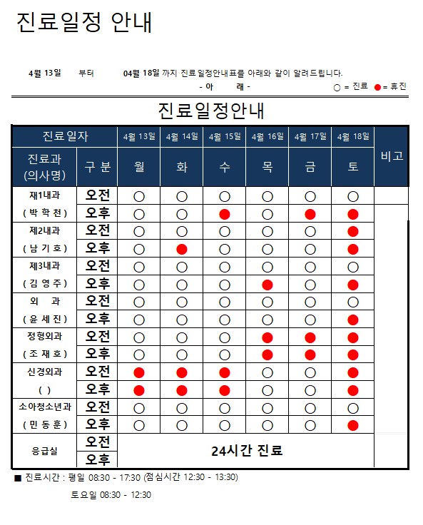 진료일정표 안내(04월 13일 ~ 04월 18일)
